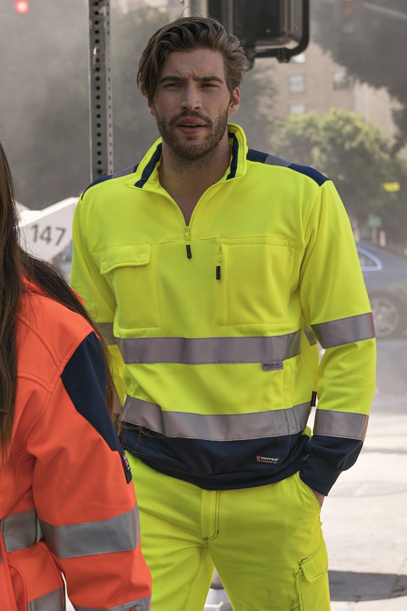 Sudadera de alta visibilidad para hombre con bandas 3M, media cremallera de naiylon con tirador metálico, puños y dobladillo elásticos, dos bolsillos delanteros con cremallera oculta, un bolsillo LOCK SYSTEM a la altura del pecho con soporte para insignia de identificación plegable y extraíble, y un bolsillo con cremallera con costuras reforzadas