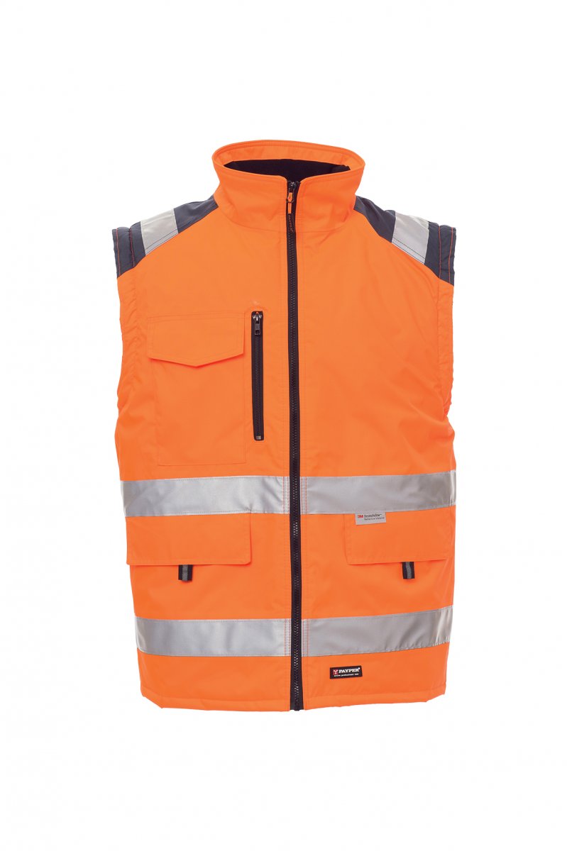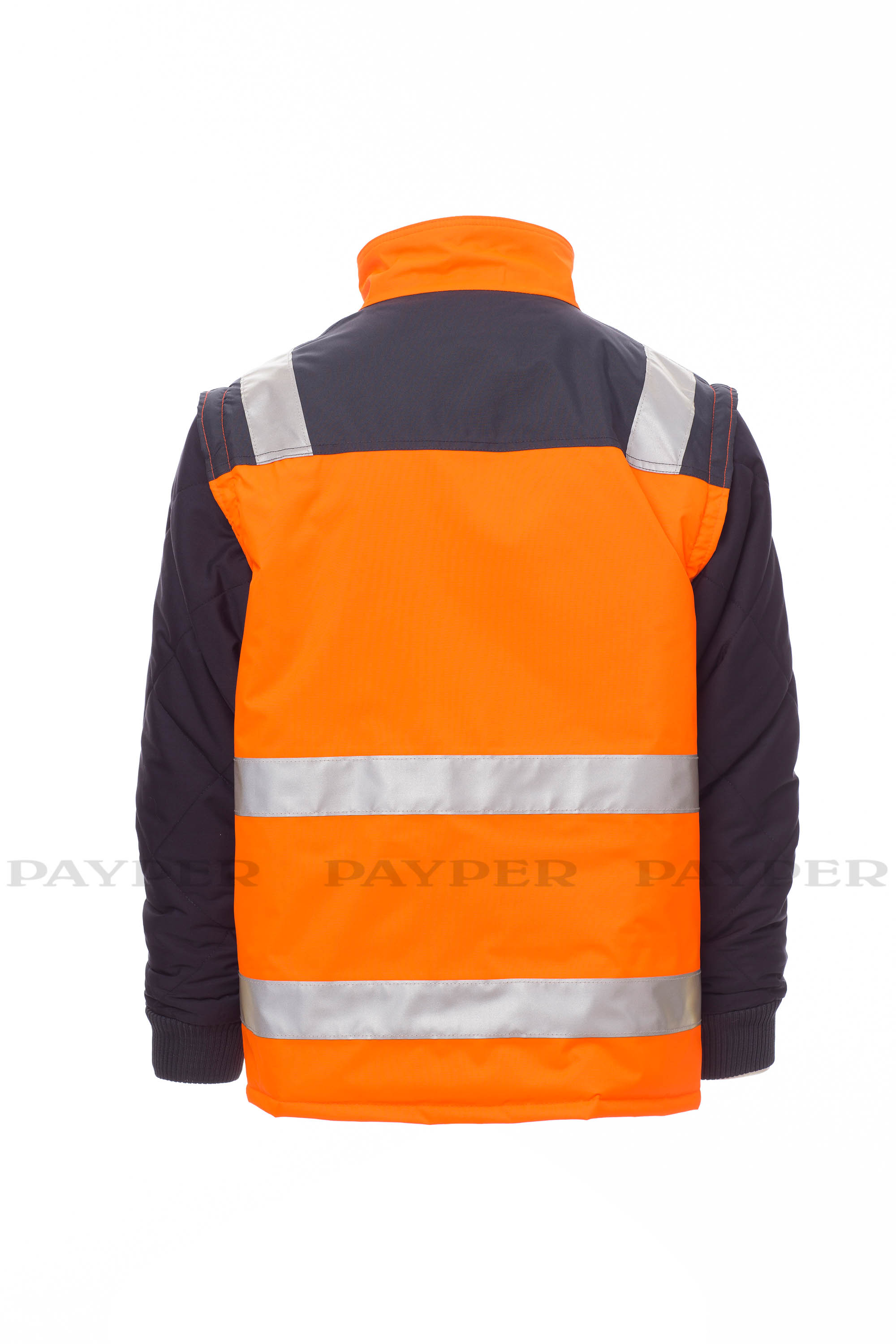 Chaqueta bicolor de alta visibilidad con bandas retrorreflectantes, apertura cerrada con cremallera de plástico con cursor metálico, mangas pegadas extraíbles, puños elásticos, dos bolsillos delanteros con tapeta y velcro, un bolsillo en el pecho con tapeta y velcro, soporte para tarjetas de identificación escamoteable y soporte para teléfono móvil, y cremallera lateral en contraste. Parte interior acolchada no extraíble, con cuello de forro polar y un bolsillo interior.
