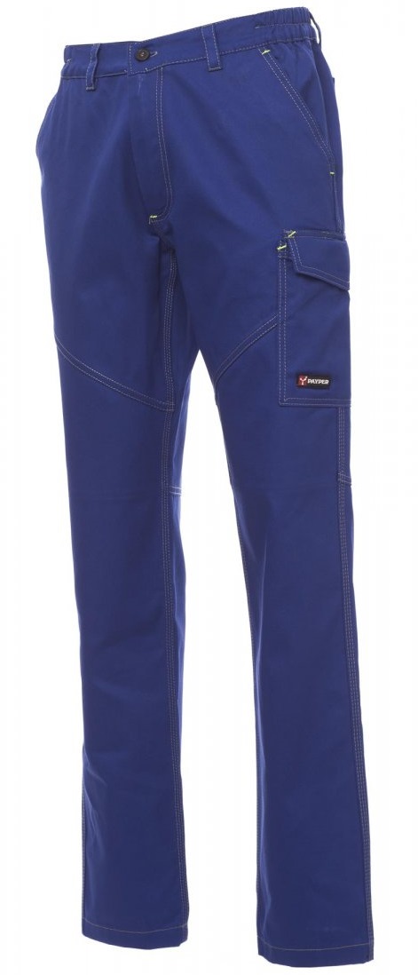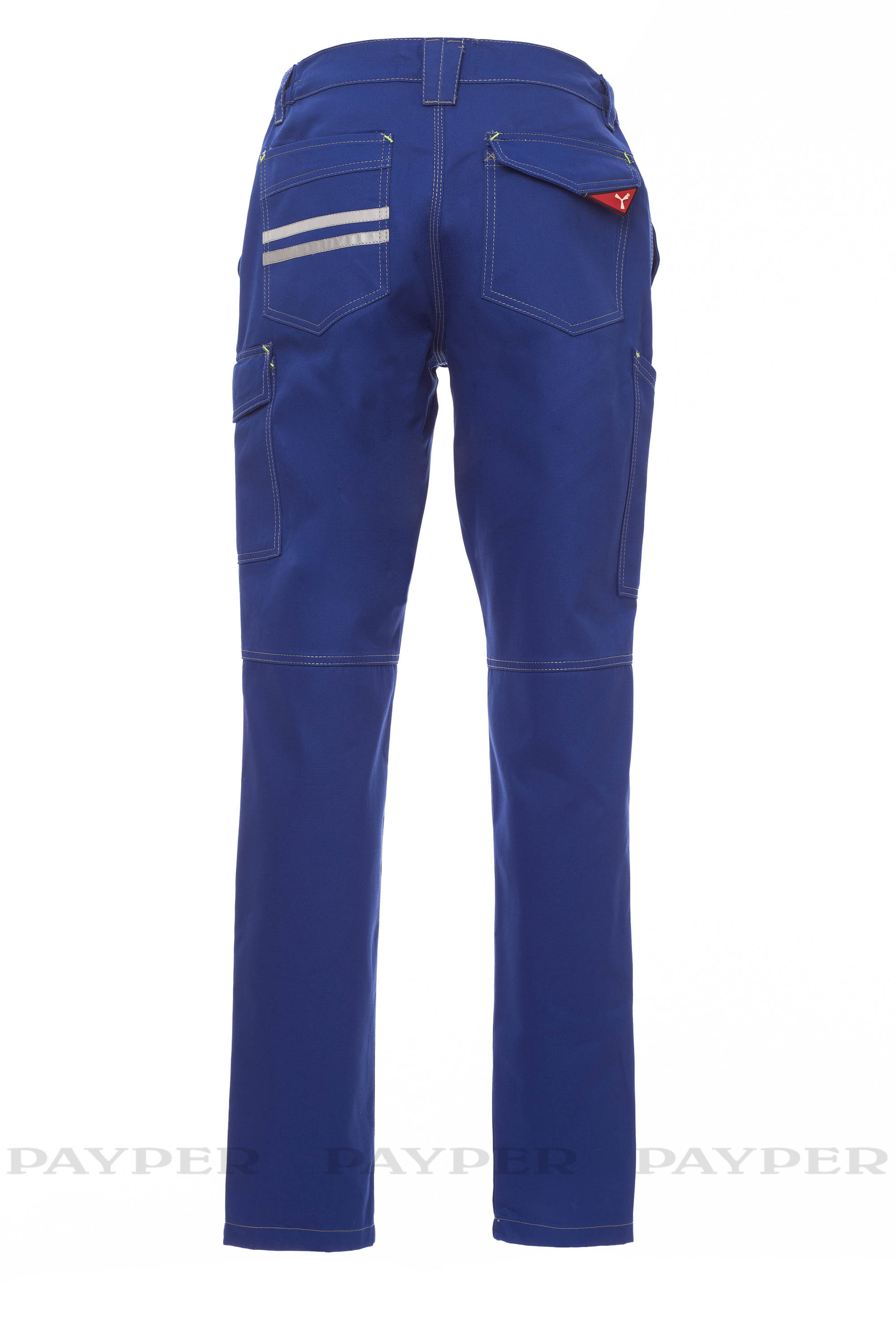 Pantalón unisex, multiestación, con elásticos laterales y trabillas en la cintura, cierre con cremallera y botón de plástico, dos bolsillos delanteros de corte clásico, un bolsillo lateral con LOCK SYSTEM, un soporte para metro; dos bolsillos traseros, uno con tapeta y velcro y otro abierto, aplicaciones y pespuntes en contraste, bandas reflectantes en el bolsillo trasero, costura triple. Botón con remache para el color blanco. Pespuntes y costuras a juego, con presillas en contraste de color amarillo fluorescente para el color Azul marino total.