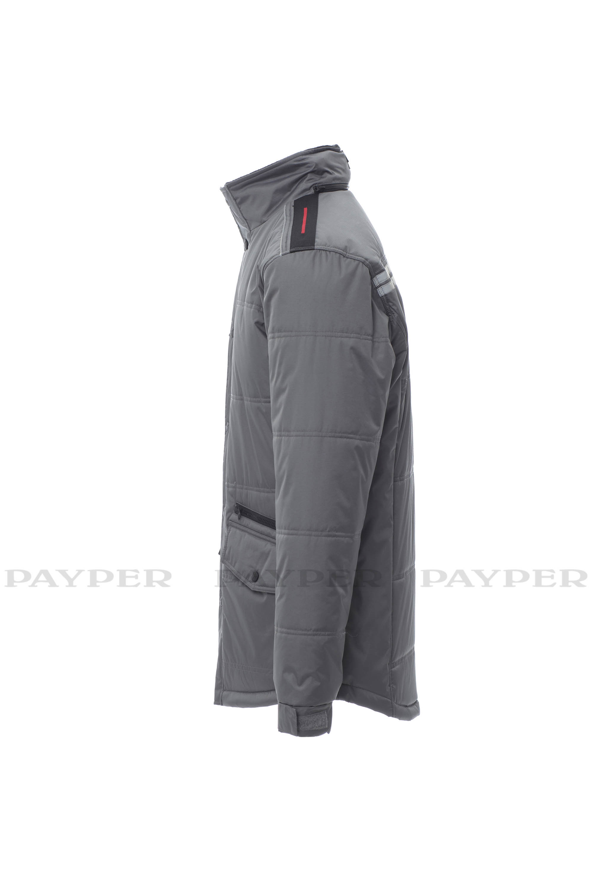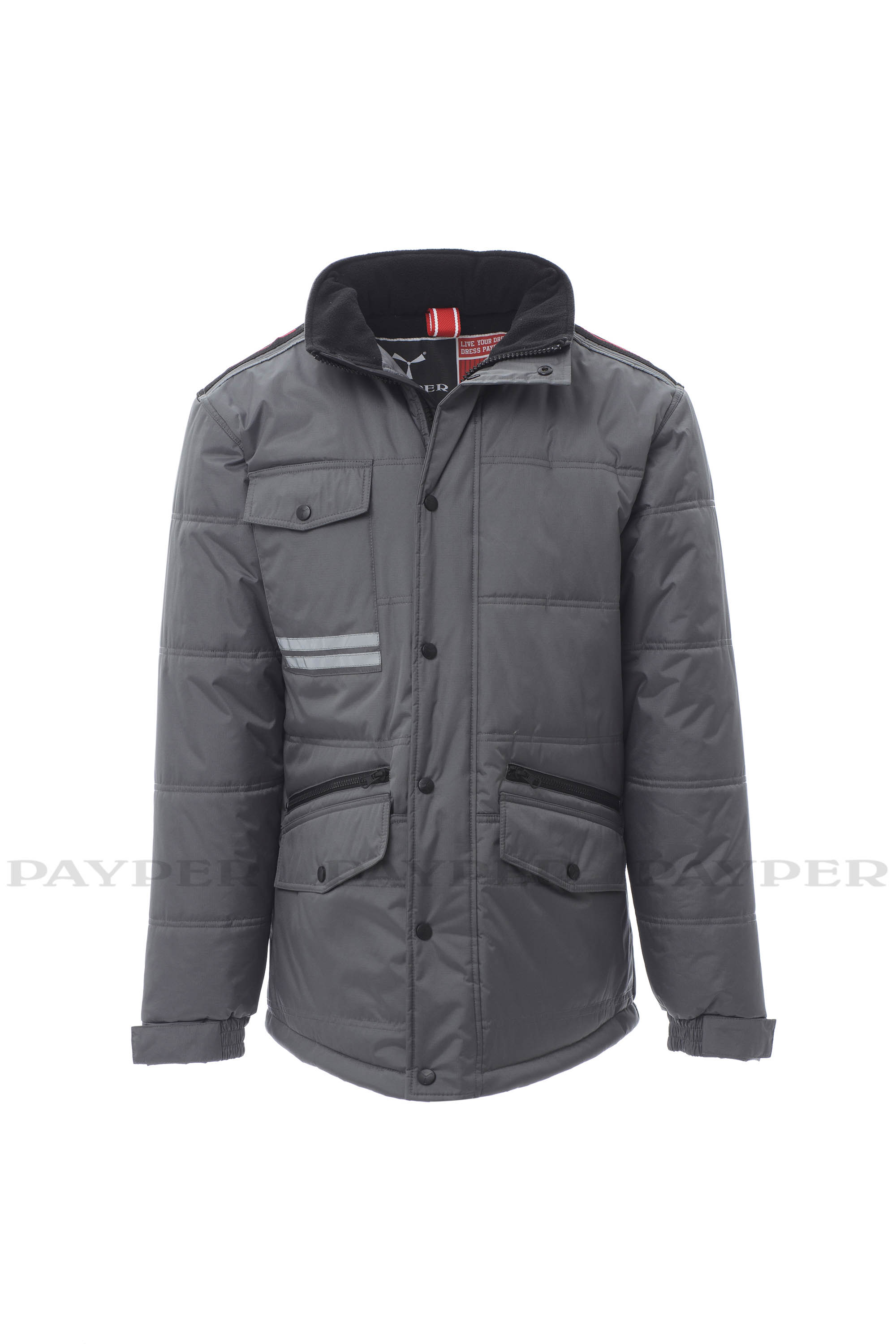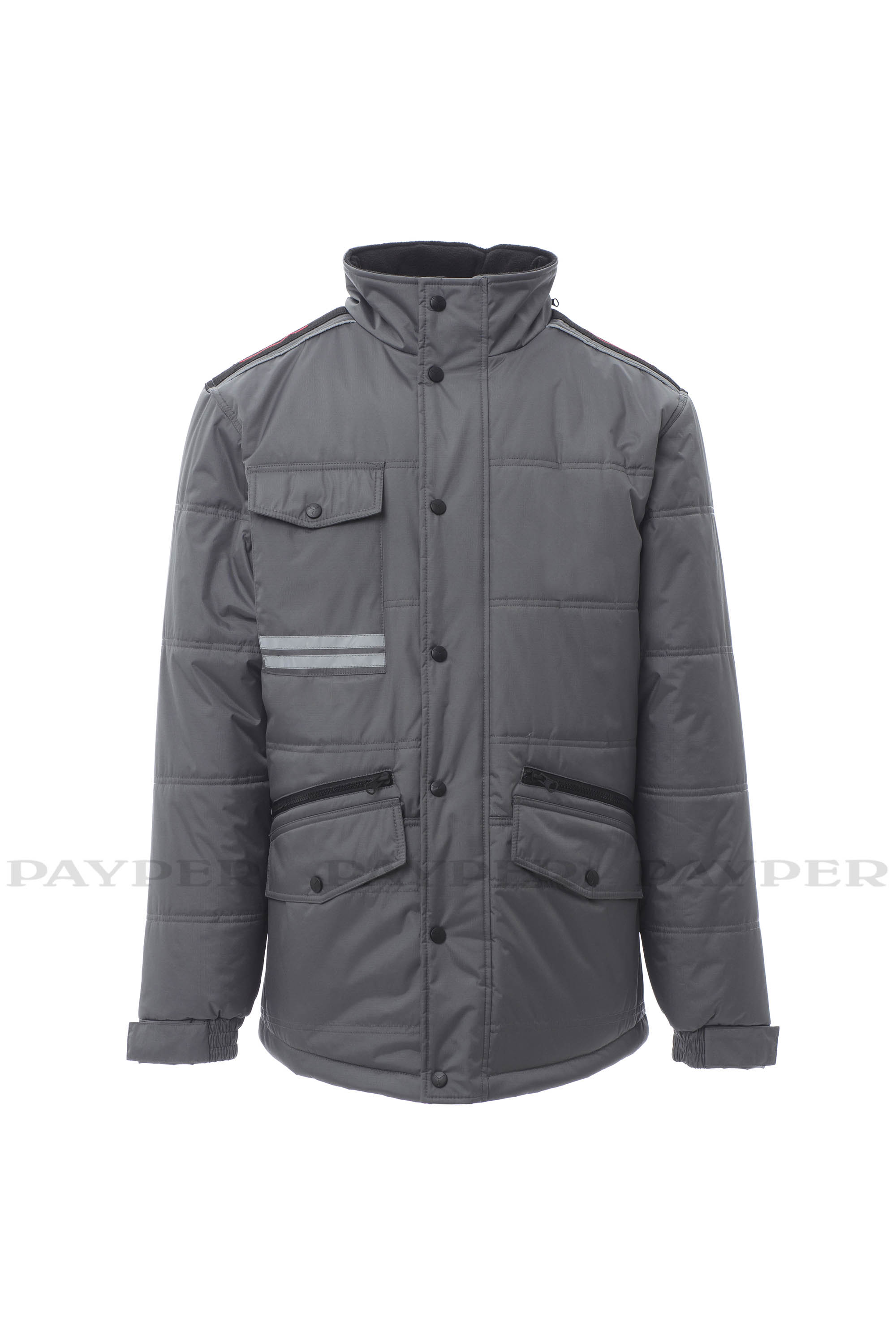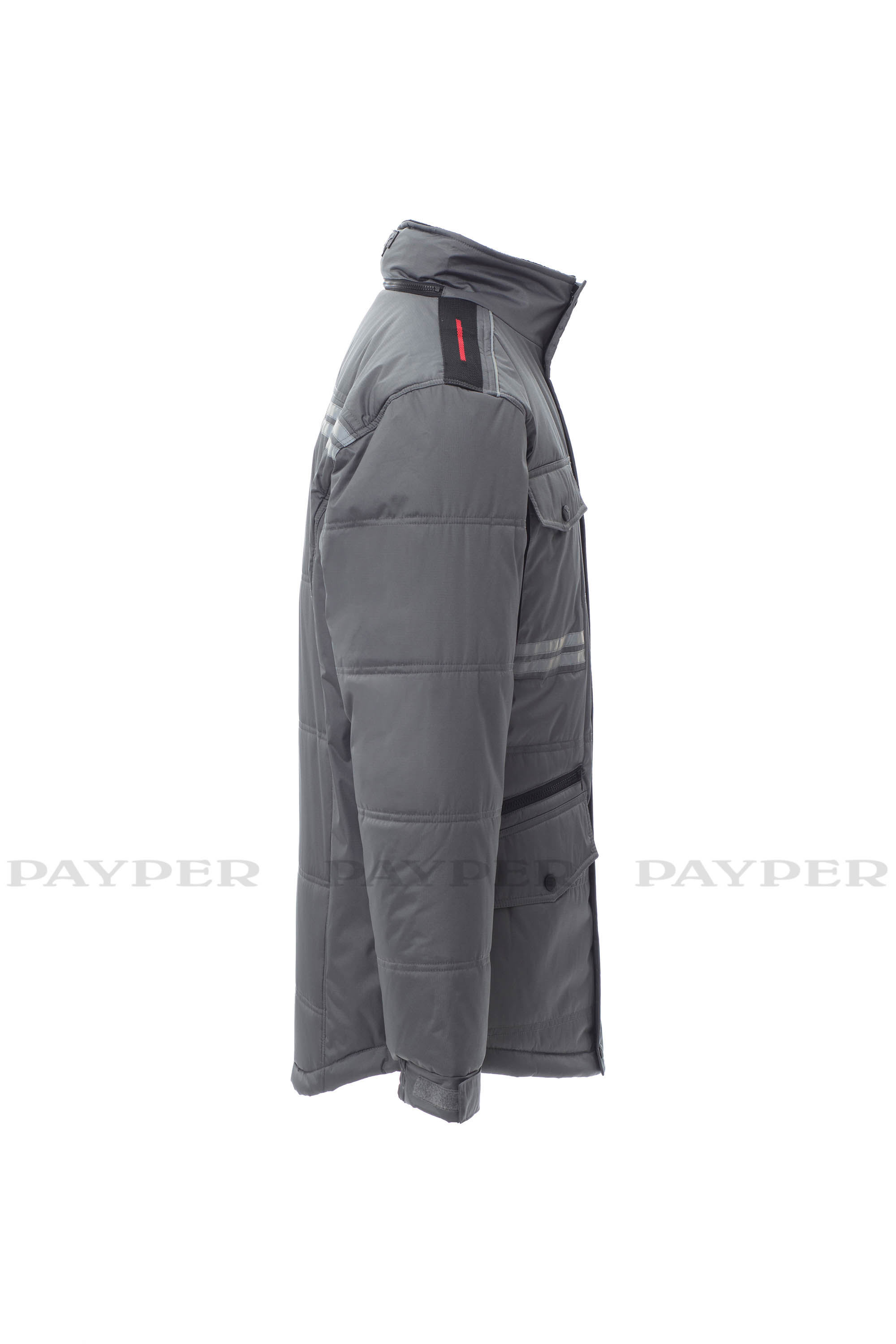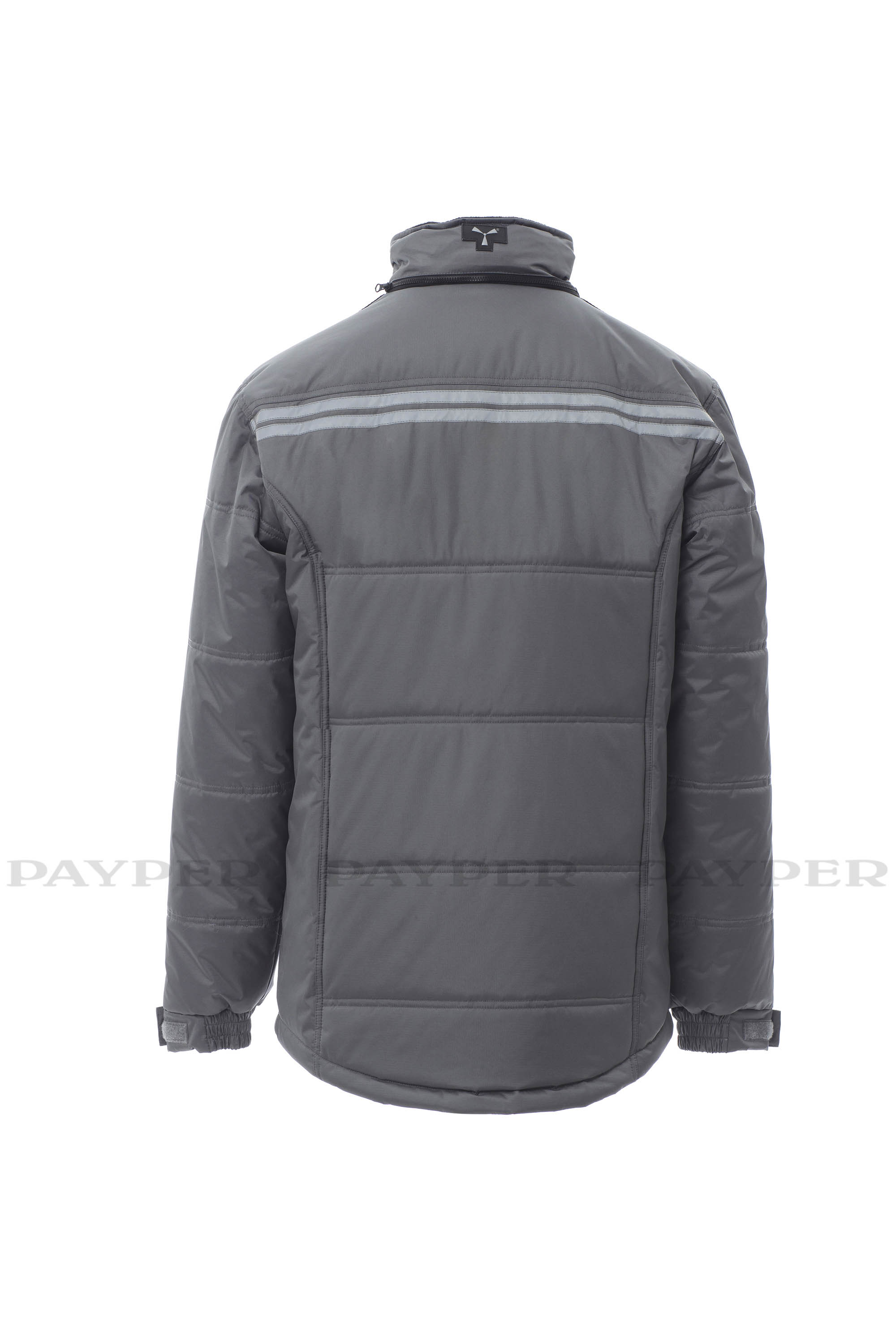 Chaqueta 3/4 para hombre, cremallera de 8 mm de plástico con cursor de metal con tapeta y botones de plástico, parte posterior contorneada y con capucha plegable en el cuello, dos bolsillos exteriores LOCK SYSTEM y dos bolsillos con cremallera, bolsillos sesgados para fácil acceso, un bolsillo a la altura del pecho para teléfono móvil y anilla de soporte para tarjeta de identificación, bandas reflectantes en el bolsillo y en la parte trasera. Interior: acolchado, forro polar de contraste en espalda y cuello, un bolsillo, cremallera interior para facilitar la impresión y el bordado.