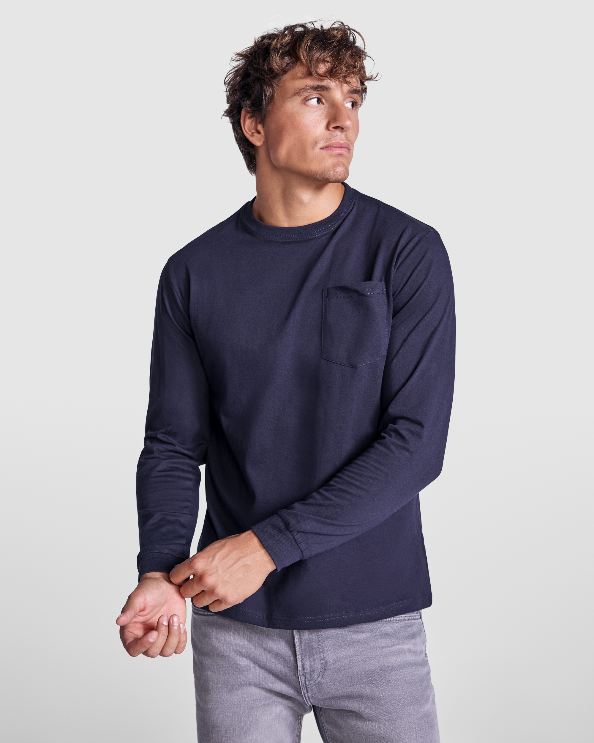 Camiseta de manga larga con cuello redondo y puños en canalé 1x1. Bolsillo en pecho izquierdo. Cubrecosturas reforzado en cuello y hombros.