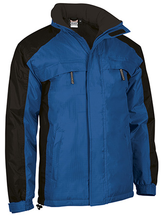 Chaquetón de abrigo en colores combinados, confeccionado en tejido técnico exterior Ripstop, recubierto de PVC con tratamiento impermeable, relleno acolchado y forro liso interior. Incluye tejido polar en cuello y bolsillos. Cuello alto y cierre con cremallera frontal. Cordón regulador interior (cordón solo en las tallas de adulto) y puños con elástico y velcro. Capucha con cordón oculta en el cuello. Dos bolsillos bajos con cremallera y dos bolsillos en pecho con cremallera. Dos bolsillos interiores. Costuras termoselladas que impiden el paso del agua. Cremallera interior para facilitar el marcaje. Bandas en color a contraste en hombros, mangas y costados.