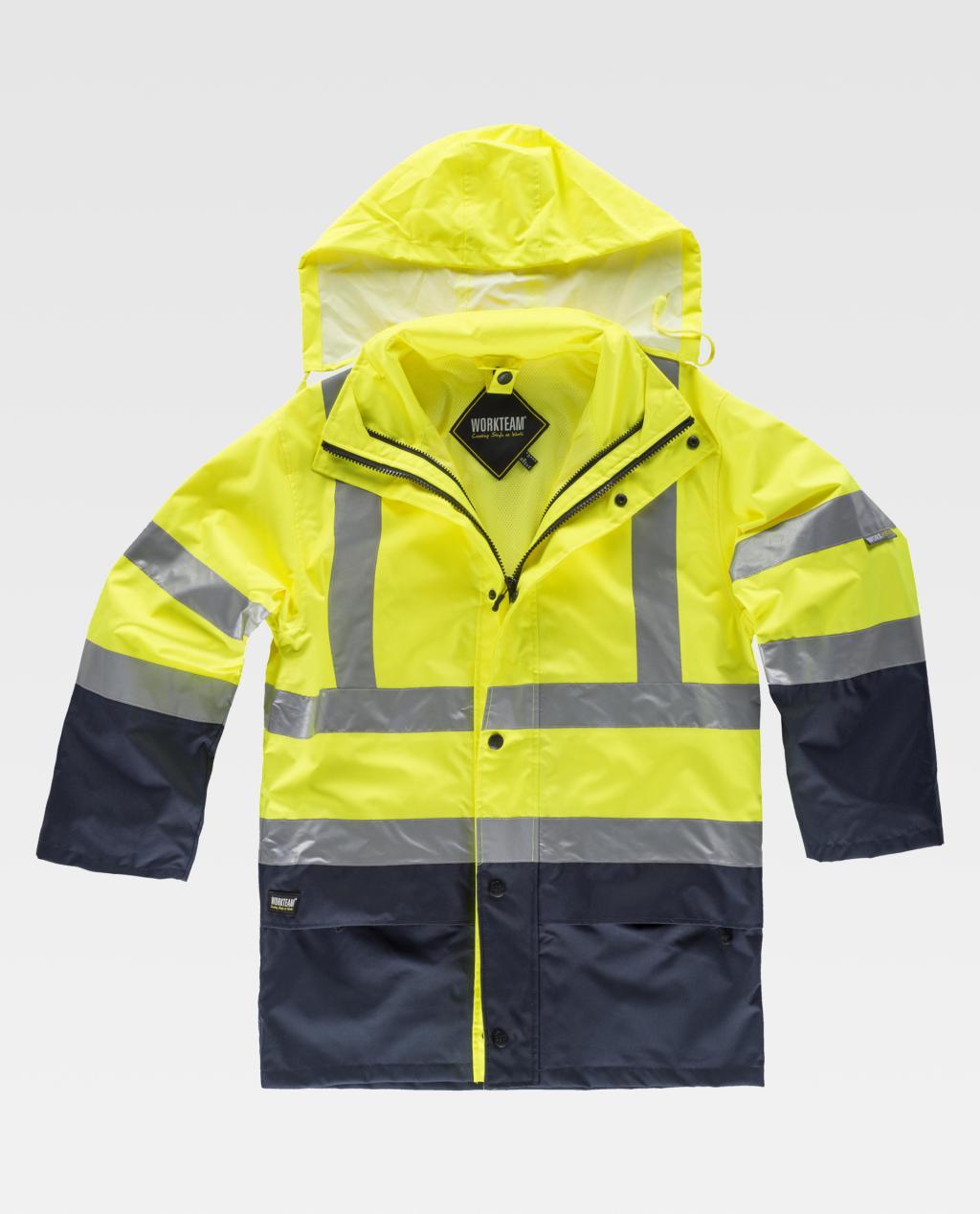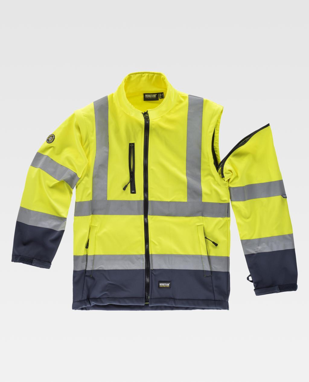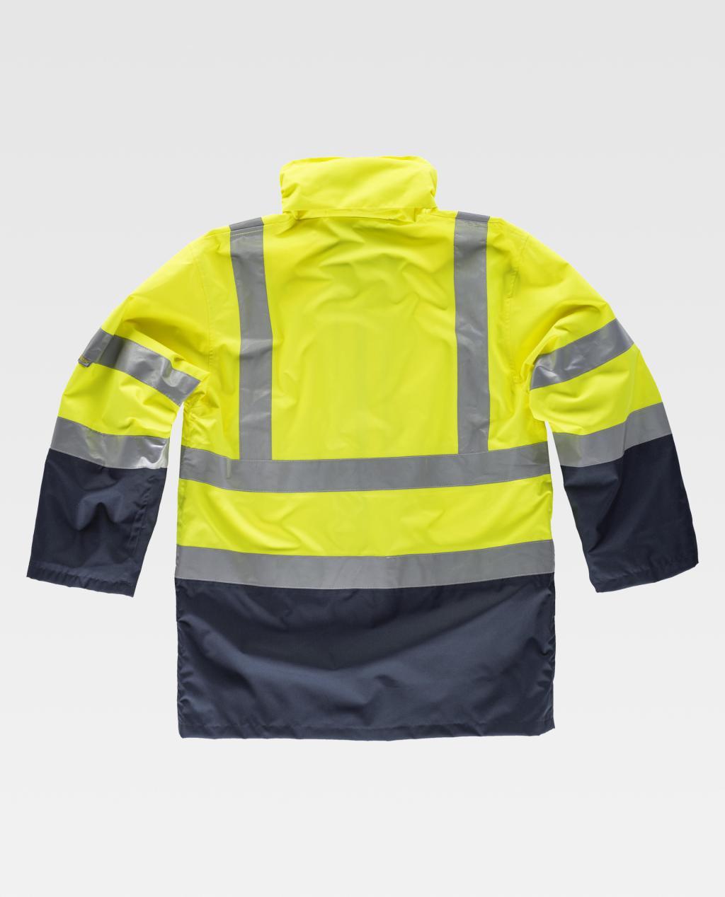 Parka convertible 4 en 1. Combinada, desmontable, con cintas reflectantes y parte superior de alta visibilidad. Exterior: Impermeable en tejido Oxford de cuello alto con capucha interior ajustable con cordón. Cierre de cremallera de doble tirador oculta por doble solapa y cierre de corchetes. Dos bolsos laterales solapados con cremallera. Una cinta reflectante en hombros y dos en pecho, espalda y mangas. Bocamanga interior con bies elástico. Forro interior de rejilla. Interior: Chaqueta WORKSHELL con mangas desmontables unida a la prenda exterior por medio de cremalleras. Cuello alto y cierre de cremallera. Un bolso de pecho y dos laterales interiores con cierre de cremallera. Una cinta reflectante en hombros y dos en pecho, espalda y mangas. Bocamanga ajustable con velcro.