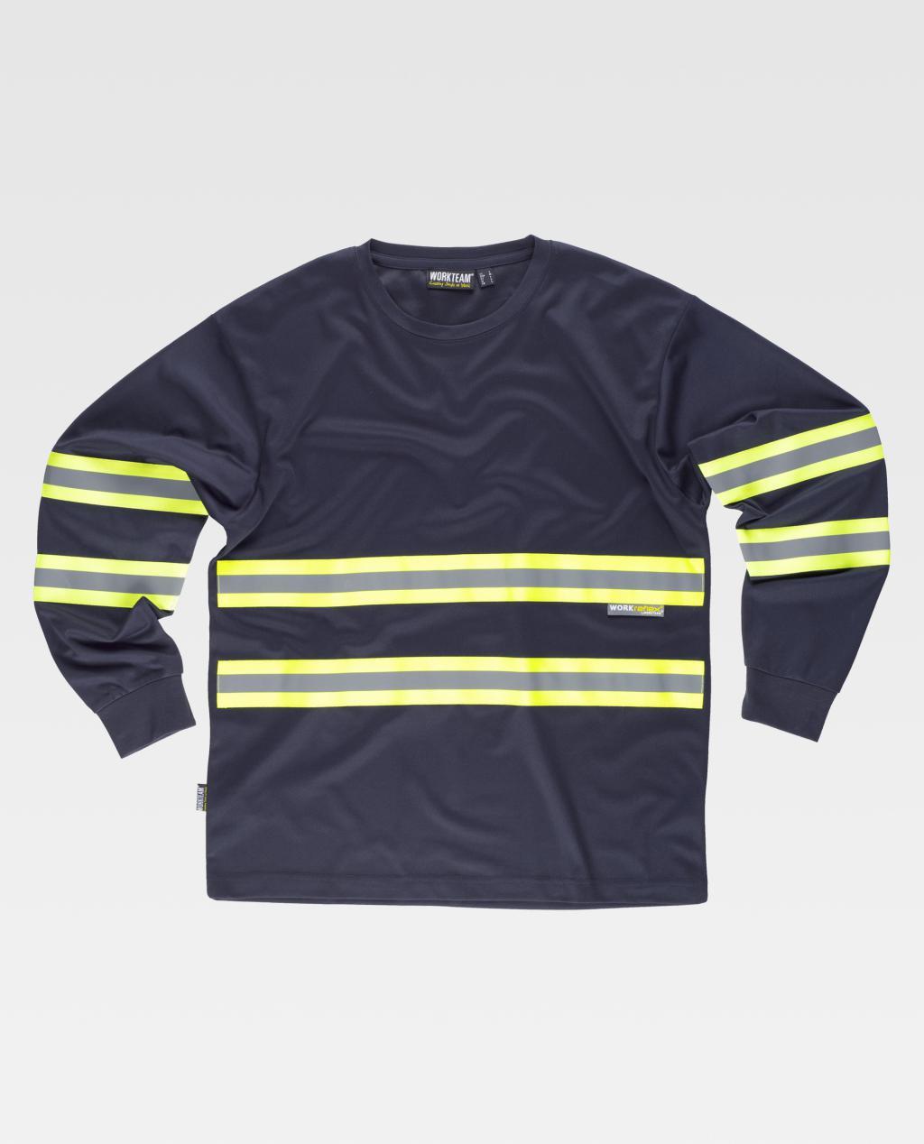 Camiseta clásica de manga larga en tejido piqué y cintas reflectante-fluorescentes. Cuello redondo en con cubrecosturas interior. Dos bandas fluorescentes con una cinta reflectante en pecho, espalda y mangas. Puño elástico.