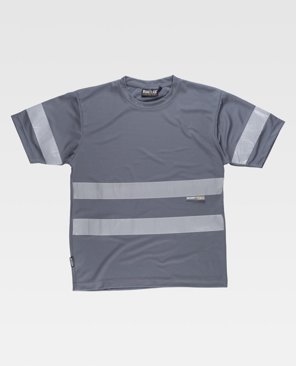 Camiseta de manga corta en poliéster ojo de perdiz con cintas reflectantes. Cuello redondo con cubrecosturas interior. Una cinta reflectante en mangas y dos en pecho y espalda. Tejido fresco y ligero de alta permeabilidad al aire. Transpirable, de fácil secado y resistente al encogimiento.