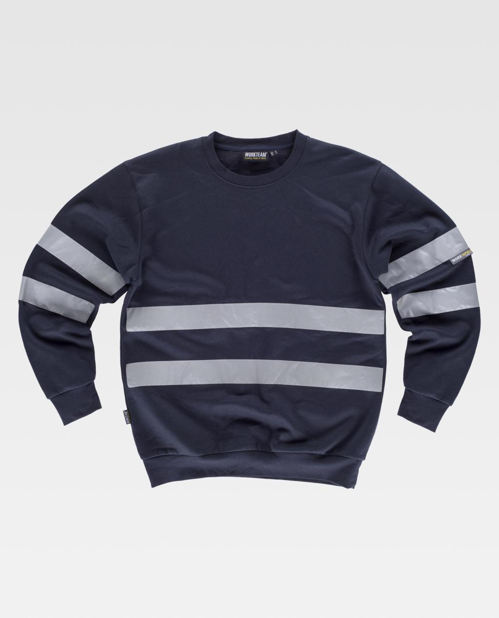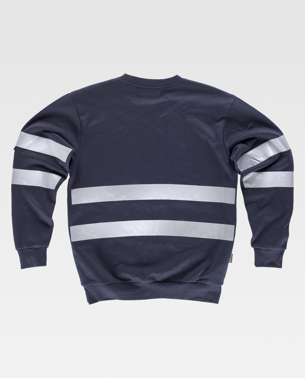 Sudadera clásica de cuello redondo con cintas reflectantes. Cubre costuras en el interior del cuello y costuras reforzadas. Dos cintas reflectantes en pecho, espalda y mangas. Suave y cálido acabado en el interior. Cuello, puños y cintura elásticos en punto canalé.