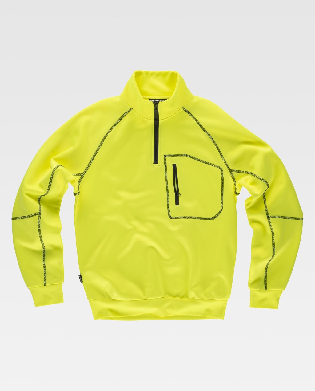 Sudadera de alta visibilidad. Cuello alto con cierre de media cremallera y costuras reforzadas. Un bolso de pecho de plastón con cierre de cremallera. Manga ranglan. Costuras planas decorativas. Suave y cálido acabado en el interior. Puños y cintura elásticos en punto canalé.