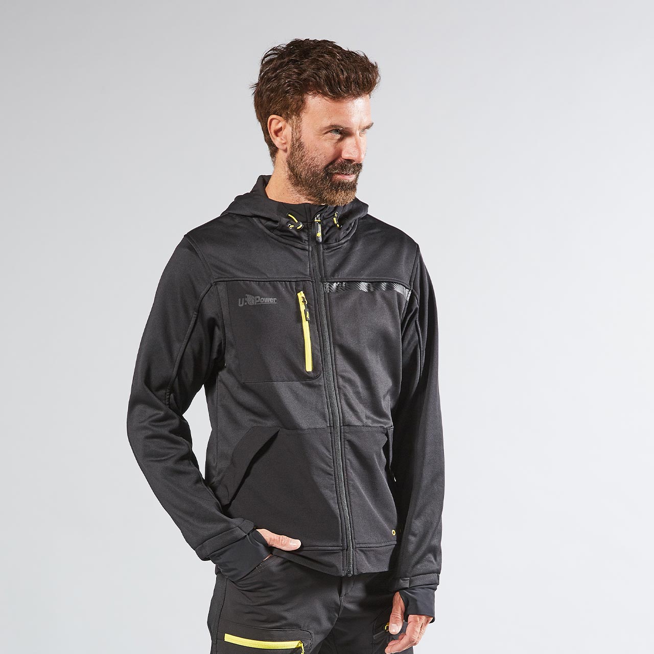 La banda reflectante en el pecho izquierdo y en la capucha garantiza visibilidad en las variantes de color Asphalt Grey y Dark Green, mientras en la variante Black Carbon las bandas tienen un efecto carbono. Impresión del logotipo reflectante “U-Power” del lado derecho del pecho.