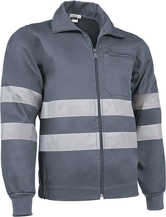 Chaqueta laboral de cuello alto, confeccionada en tejido de sarga, resistente y duradera. Cierre central con cremallera entera. Puños elásticos de canalé y bajo con elásticos en los laterales para un mejor ajuste de la prenda al cuerpo. Incluye un bolsillo con cierre de cremallera en pecho izquierdo. Lleva dos bandas de material retrorreflectante cosidas en el contorno por debajo del pecho, y otras dos bandas en cada manga.