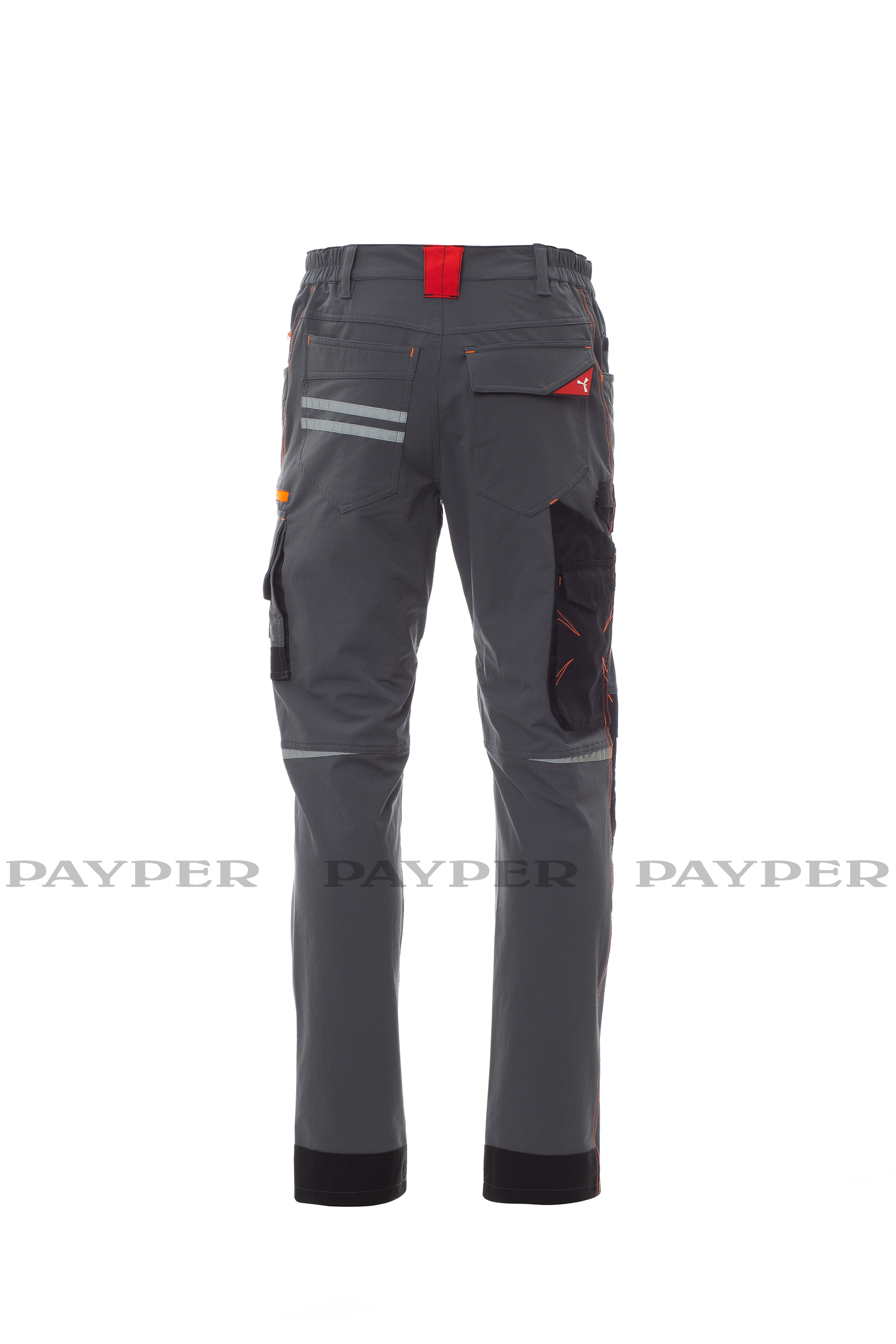 Pantalón unisex, tejido «4 way stretch», para verano, con elásticos laterales y trabillas en la cintura, cierre con cremallera y botón personalizado. En el delantero tiene dos bolsillos redondeados, un bolsillo pequeño para monedas a la derecha y un bolsillo pequeño de seguridad cerrado con cremallera a la izquierda. En la parte delantera de la pernera izquierda presenta 3 bolsillos: un bolsillo horizontal cerrado con una cremallera, un bolsillo con tapeta perfilada cerrado con velcro y con soporte para tarjeta de identificación y un bolsillo pequeño vertical cerrado con cremallera. Banda retrorreflectante en la parte delantera de la pernera derecha. Ambas perneras disponen de bolsillos para rodilleras con apertura por la parte superior. En la parte trasera presenta un bolsillo con tapeta cerrado con velcro y un bolsillo sin tapeta pero con 2 bandas retrorreflectantes, una anilla para el martillo (pernera derecha), un bolsillo abierto para el metro (pernera derecha) y un bolsillo para el teléfono móvil con tapeta y velcro (pernera derecha), aplicaciones retrorreflectantes a la altura de la rodilla (ambas perneras) y cinta talonera de tejido en contrate (ambas perneras). También presenta pespuntes laterales y costuras de refuerzo en contraste en distintos puntos. En las tallas (italianas) centrales 48-50-52, el interior de la pernera tiene una longitud normal de 82 cm.