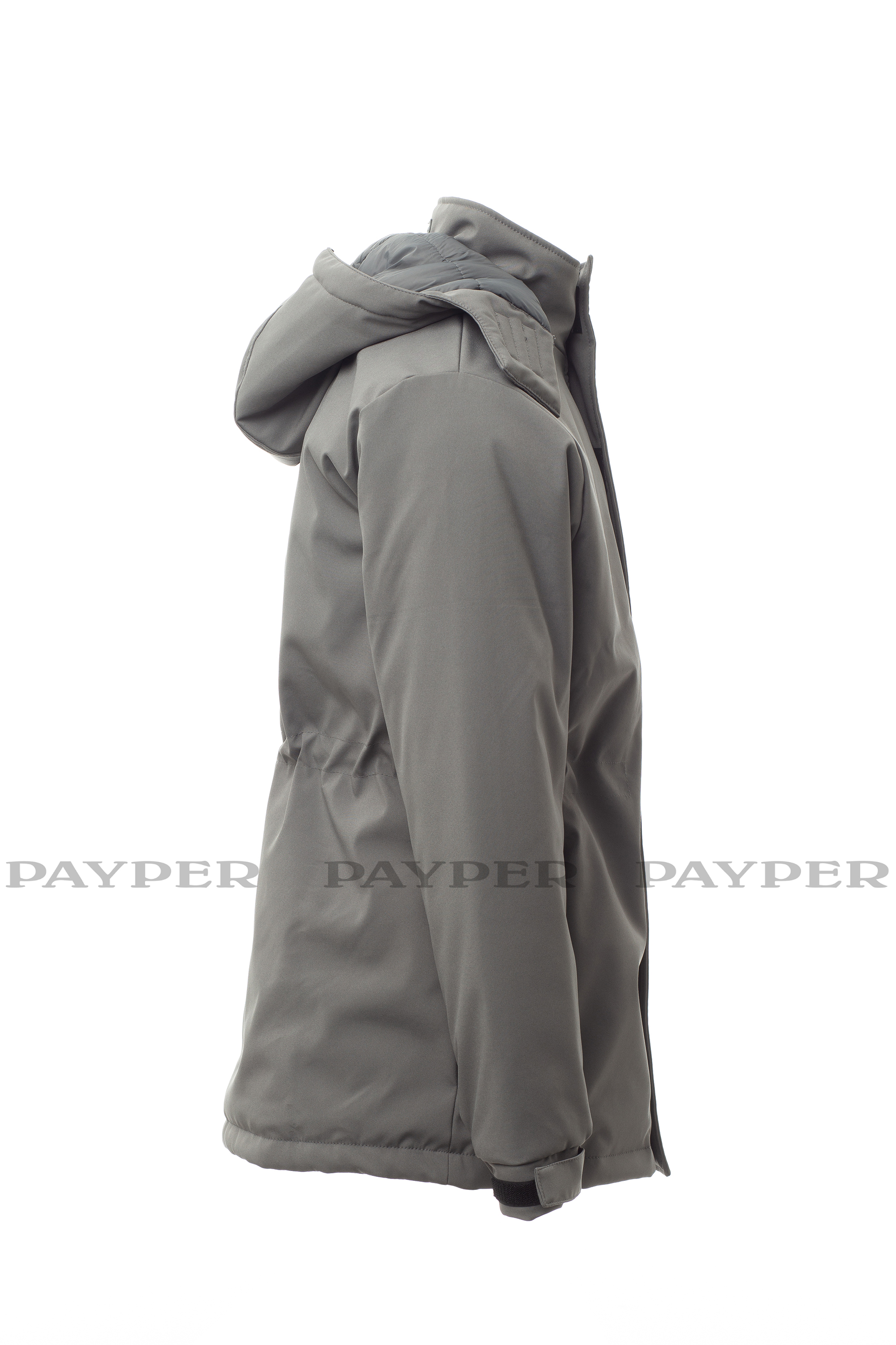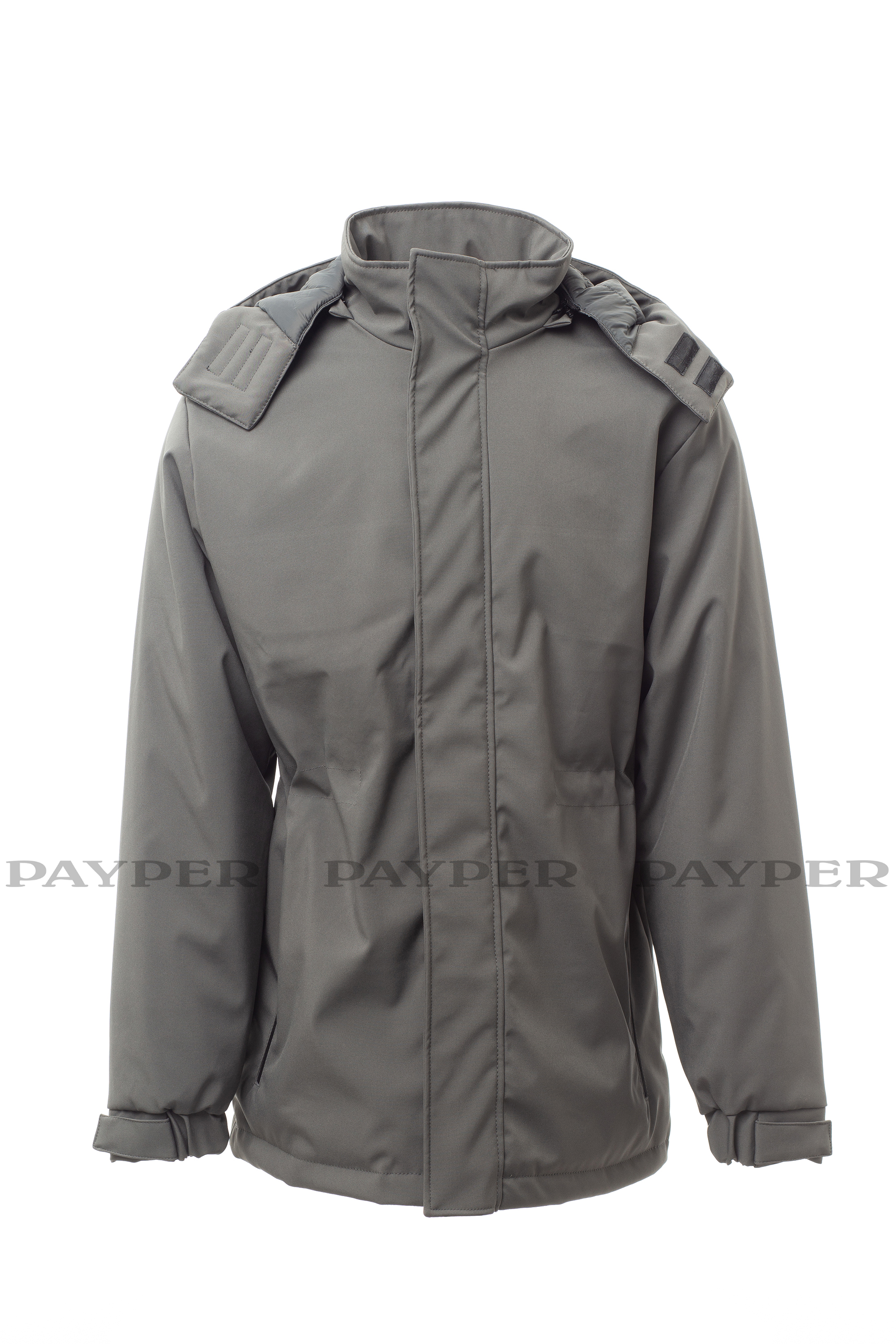 WP 8000 mm H₂O, WVT 5000 g/m² 24h. Soft-shell acolchado de hombre, con cierre de velcro y cremallera SBS con cursor de metal con sistema de bloqueo semiautomático y tirador personalizado. Capucha desmontable y con cierre de velcro en la parte delantera. Cintura con cordón, dos bolsillos exteriores con cremallera recubierta, un bolsillo interior de ojal con cierre velcro, un bolsillo interior para tableta con cierre de velcro. Puños elásticos ajustables con velcro. Parche personalizado en la parte posterior del cuello, con detalle retrorreflectante.