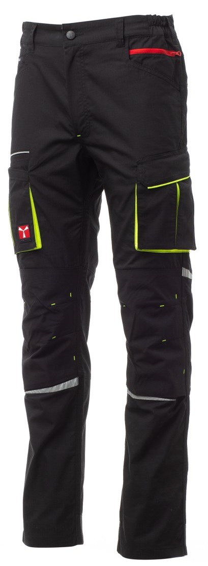 Pantalón unisex de tejido elástico, de verano, con elásticos laterales y trabillas en la cintura, cierre con cremallera y botón personalizado. En el delantero tiene dos bolsillos contorneados, un bolsillo pequeño para monedas a la derecha y un bolsillo pequeño de seguridad cerrado con cremallera a la izquierda. En la parte delantera de la pernera izquierda presenta un bolsillo con fuelle, tapeta cerrada con velcro y soporte para tarjeta de identificación. En la parte delantera de la pernera derecha presenta un bolsillo para el teléfono móvil con borde retrorreflectante y un bolsillo con fuelle. Ambas perneras disponen de bolsillos para rodilleras en tejido en contraste (con apertura por la parte inferior) y de aplicaciones retrorreflectantes que indican la apertura. En la parte trasera presenta un bolsillo con tapeta cerrado con velcro, un bolsillo sin tapeta pero con 2 bandas retrorreflectantes, un bolsillo para el metro (pernera derecha), aplicaciones retrorreflectantes a la altura de la rodilla (ambas perneras) y cinta talonera de tejido en contrate (ambas perneras). También presenta: - costuras de triple aguja en la entrepierna y en el interior y exterior de la pernera - costuras de refuerzo en contraste en distintos puntos. En las tallas (italianas) centrales 48-50-52, el interior de la pernera tiene una longitud normal de 82 cm.