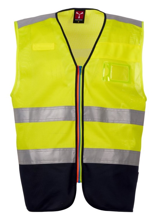 Chaleco sin forro de alta visibilidad confeccionado en malla transpirable en la parte superior y en tejido Dry-Tech de color de contraste en la parte inferior, con bandas retrorreflectantes en hombros y cuerpo. Cierre con cremallera SBS, con cinta bicolor. Con la prenda puesta: trabilla multifunción a la altura del pecho derecho, banda en tejido Dry-Tech para personalización y soporte fijo para tarjeta de identificación a la altura del pecho izquierdo.