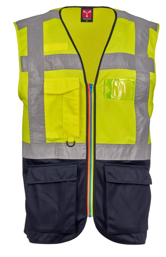Chaleco de alta visibilidad, en tejido Dry-Tech, parte inferior de color de contraste, con bandas retrorreflectantes horizontales en hombros, pecho y cintura y dos bandas retrorreflectantes verticales. Cierre con cremallera, con cinta bicolor. Soporte fijo para tarjeta de identificación a la altura del pecho izquierdo con la prenda puesta. Trabilla multifunción, bolsillo para bolígrafos cerrado con velcro y anilla en el pecho derecho con la prenda puesta. Dos bolsillos externos con fuelle cerrados con velcro y apertura lateral en la parte inferior.