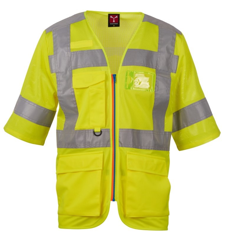 Chaleco sin forro de manga corta de alta visibilidad confeccionado en malla transpirable en la parte superior y en tejido Dry-Tech en la parte inferior, con bandas retrorreflectantes horizontales en hombros, pecho y cintura y dos bandas retrorreflectantes verticales. Cierre con cremallera SBS, con cinta bicolor. Soporte fijo para tarjeta de identificación a la altura del pecho izquierdo con la prenda puesta. Trabilla multifunción, un bolsillo para bolígrafos cerrado con velcro y anilla en el pecho derecho con la prenda puesta. Dos bolsillos exteriores con fuelle cerrados con velcro en la parte superior y apertura lateral.