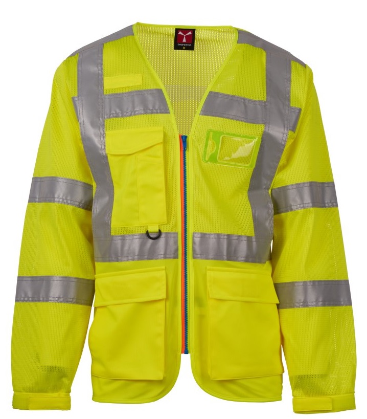 Chaleco sin forro de manga larga de alta visibilidad confeccionado en malla transpirable en la parte superior y en tejido Dry-Tech en la parte inferior, con bandas retrorreflectantes horizontales en hombros, pecho y cintura y dos bandas retrorreflectantes verticales. Cierre con cremallera SBS, con cinta bicolor. Soporte fijo para tarjeta de identificación a la altura del pecho izquierdo con la prenda puesta. Trabilla multifunción, un bolsillo para bolígrafos cerrado con velcro y anilla en el pecho derecho con la prenda puesta. Dos bolsillos exteriores con fuelle cerrados con velcro en la parte superior y apertura lateral.