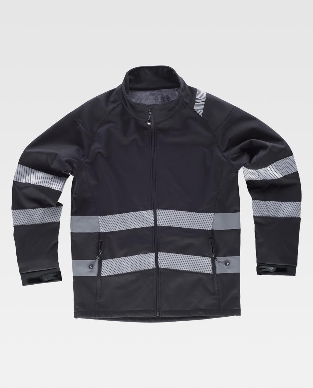 Chaqueta Workshell con cintas reflectantes. Cuello alto y cierre de cremallera de nylon de cierre invertido. Solapa protectora interior vuelta en la parte superior cubriendo la cremallera. Dos bolsos laterales interiores con cremalleras de nylon. Dos cintas reflectantes segmentadas termoadhesivas en pecho y mangas. Dos cintas cosidas en los costados y en la espalda. Cinta decorativa personalizada en un hombro. Bocamanga ajustable con velcro. Cordón elástico con pieza ajustable en el bajo. Tejido corta vientos, repelente al agua y resistente al desgarro con membrana interior transpirable y aislante e interior de alta capacidad térmica. Tejido interior super suave, con forro de rejilla en delantero.